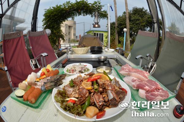 제주최초 캠핑 테마 흑돼지 전문점실내 장식으로 캠핑장 분위기 연출깊은 맛 추자도산 황게장 인기몰이