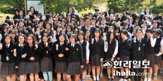 '2015 제주감귤국제마라톤대회'에 자원봉사로 나서는 삼성여자고등학교 학생·교사들. 강경민기자