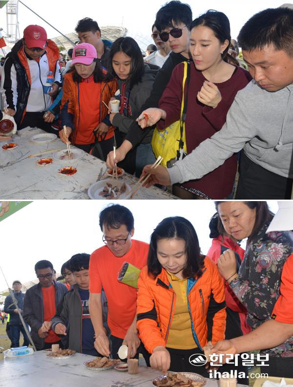 제주감귤국제마라톤대회 달림이들과 그 가족들이 제주에서 나는 싱싱한 먹거리를 맛보고 있다. 사진=특별취재반