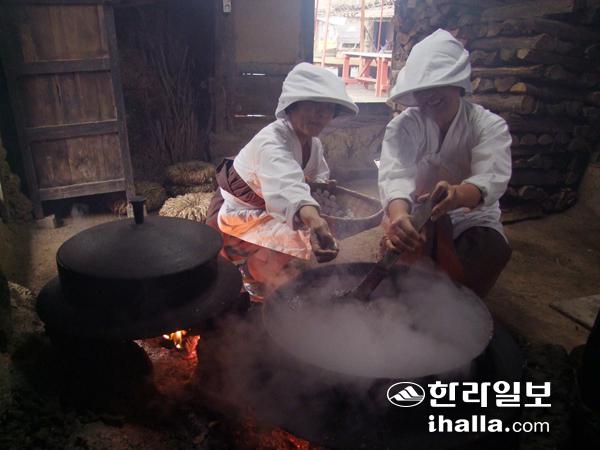 팥죽은 요즘 슬로우푸드로, 겨울별미로도 새롭게 각광받고 있다. 동지팥죽 체험 행사가 제주민속촌에서 진행된다는 것도 나름 뜻깊은 일이다. 옛 선인들의 지혜가 담긴 세시풍속을 되새겨보기 위해 행사를 준비했다고 한다. 그래서 전통방식으로 팥죽 만드는 과정을 체험할 수 있도록 벌써부터 가마솥에 장작불을 이용해 팥죽을 만들고 있다.