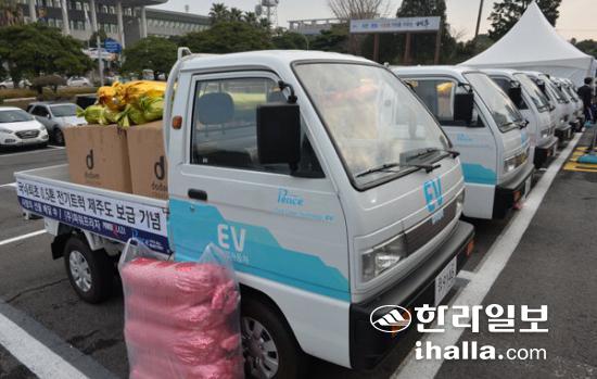 24일 제주도청 제1청사 주차장에서 국내 최초로 개발된 도시·농촌 생계형 화물전기차 '라보 피스' 인도식이 열렸다. 제주도는 국내 첫 보급을 기념해 라보 피스를 이용한 사랑의 선물 배달 행사도 개최했다. 강경민기자