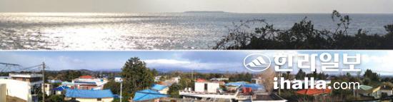 황개해변에서 바라본 눈부신 바다와 멀리 지귀도(위), 마을회관 옥상에서 한라산 방향으로 바라본 마을 전경(아래).