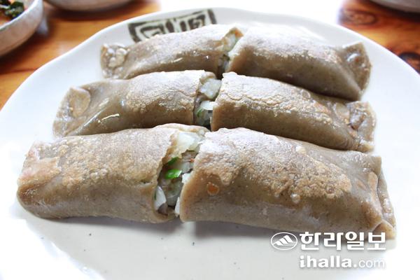 두툼하게 말아진 메밀빙떡은 비주얼이 식욕을 자극할 정도로 먹음직스럽다. 메밀가루를 멀그스름하게 반죽해 얇게 지진 다음 펼친 뒤 무채나물 등을 소로 넣어 돌돌 말아 만든다. 무채나물의 아삭아삭함이 뒷맛을 개운하게 해준다.