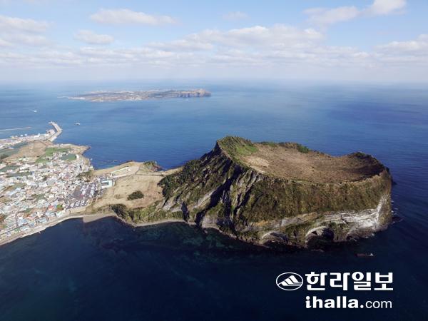 성산일출봉과 그 위로 펼쳐진 우도 전경. 한라일보 DB