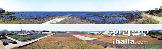 검은 갯바위들이 설치미술품처럼 해안조간대를 따라 펼쳐진 바닷가(위)와 전국 최초로 기계화 영농을 위해 경지정리를 했다는 구름드르와 마을풍경(아래).