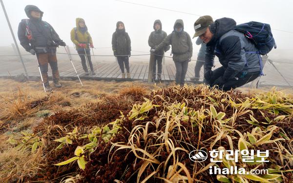 본보 취재진과 전문가로 구성된 한라산 특별취재팀이 윗세오름에서 영실로 내려오는 등산로에서 시로미 자생 상황을 확인하고 있다. 조릿대를 피해 바위 위에 붙어 자라는 시로미 사이로 제주조릿대와 온대성 풀이 기다랗게 올라온 모습이 눈에 띈다. 강경민기자