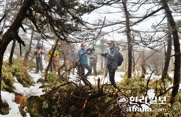 ▶어리목부터 백록담 턱밑까지= 여전한 추위에 앙상한 뼈대를 드러낸 나무 아래로 조릿대가 지천이었다. 어리목코스에 들어서자마자 무릎 높이의 조릿대가 등산로를 에워쌌다. 길고 둥그런 푸른 잎에 주변이 하앟게 센 '제주조릿대'다. 볏과 식물로 우리나라에선 한라산에서만 자란다.