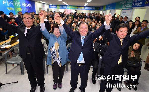 제20대 국회의원 선거 제주시갑 선거구의 더불어민주당 강창일 후보가 31일 오전 제주시 연동 소재 한일시티파크에 자리 잡은 선거사무소에서 출정식과 함께 선거대책위원회 발족식을 갖고 필승을 다짐하고 있다. 강희만 기자