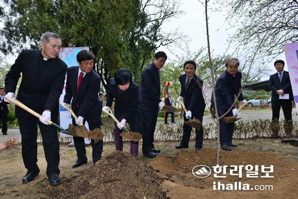이날 천주교 대구대교구내에 심은 제주 토종 왕벚나무 2그루는 국립산림과학원이 지난해 4월 기준 어미나무로 명명한 한라산 관음사 지구 왕벚나무에서 복제한 5년생 후계목이다.