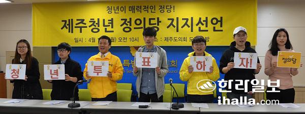 정의당에 대한 지지의사를 밝힌 제주지역 청년 55명 대표단은 11일 제주도의회 도민의방에서 기자회견을 갖고 제20대 국회의원선거에서 정의당 지지를 공식 선언하고 있다. 강경민 기자