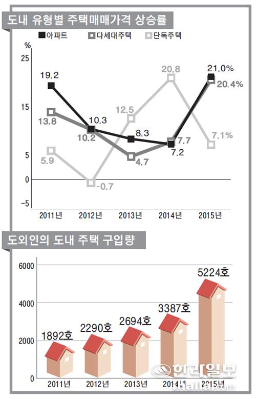 ▶아파트값 1년새 1억5000만원 급등…근로자 소득은 최저=2011년부터 2015년까지 제주지역의 주택매매가격은 전년 대비 연평균 11.3% 상승하면서 전국평균(6.6%)보다 훨씬 높았다. 특히 2015년의 경우 18.0% 올라 유난히 상승폭이 가팔랐다. 작년의 경우 아파트와 다세대주택이 각각 21.4%, 20.4% 급등했고 단독주택은 7.1%의 상승률을 기록했다.
