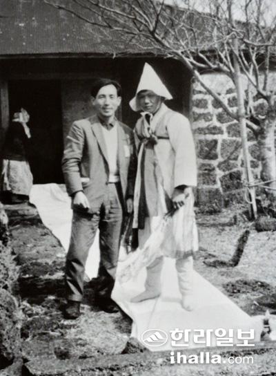 제주무속굿 현장을 누비던 시절의 진성기 제주민속연구소장(왼쪽). '청년 진성기'의 모습이 담긴 흑백사진이다.