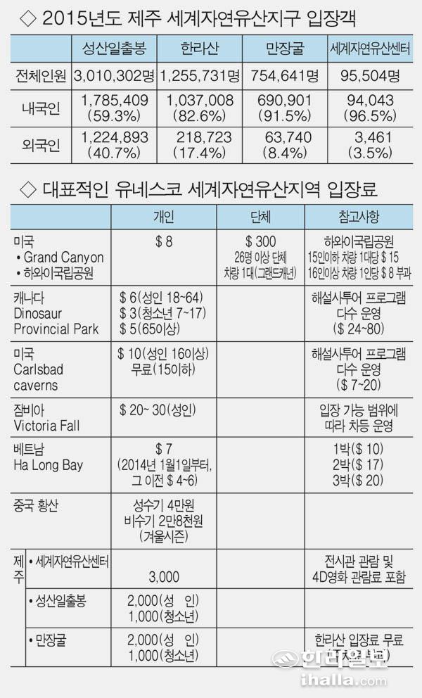 이에 비해 현재 제주 세계자연유산지구 입장료는 비교조차 되지 않는다. 거문오름 세계자연유산센터 3000원(전시관 관람 및 4D 영화 관람료 포함), 10인 이상 단체 2400원, 어린이 2000원씩이다. 성산일출봉은 성인 2000원, 청소년 1000원, 만장굴 성인 2000원, 청소년 1000원 등이다. 한라산국립공원은 2007년부터 정부의 국립공원 무료시책에 따라 무료다.