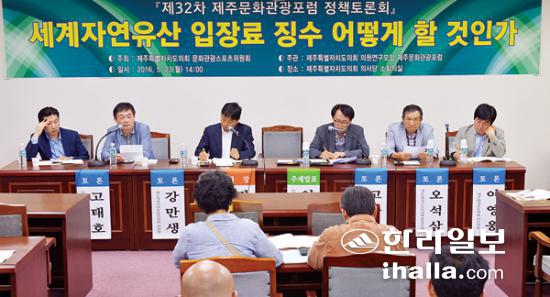 세계자연유산지구 입장료 현실화가 또다시 쟁점으로 떠올랐다. 제주특별자치도의회 제주문화관광포럼은 23일 도의회에서 입장료를 어떻게 할 것인가를 놓고 정책토론회를 가졌다. 강희만기자