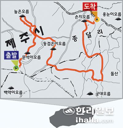 서양금혼초가 거대한 융단을 이룬 정상에서 허기를 달래며 잠시 몸을 쉬었다. "꽃밭에서 점심을 먹는 것은 처음이네요." 함께 길을 걸은 어떤 이의 말처럼 어느 때보다 특별한 한 끼였다. 이어 구좌성산곶자왈, 목장길을 따라 작고 봉긋하게 솟은 알오름을 넘어 손지봉에 올랐다.
