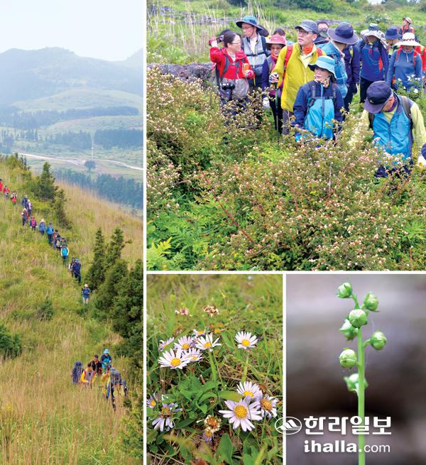 한줄로 길게 이어진 탐방객들의 이동 모습이 저 멀리 푸르른 오름을 배경으로 한폭의 그림같은 풍경을 만들어내고 있다(左 上), 탐방객들이 국수나무꽃 앞에서 잠시 걸음을 멈췄다(右 上), 계절을 잊은 채 봄날에 피어난 쑥부쟁이(左 下) ⑤노루발풀(右 下). 강희만기자