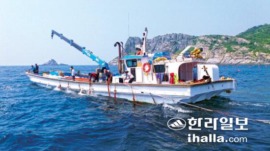 추자도수협 관계자들이 추자도 본섬에서 7.5㎞ 떨어진 제주의 최북단인 횡간도 앞 해상양식장에서 지난 4월 종묘한 우렁쉥이(멍게) 종묘의 성장 상태를 살펴보고 있다. 백금탁기자