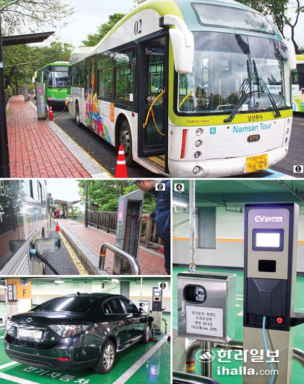 제주보다 앞서 전기차 마스터플랜을 제시했던 서울시는 국내 최초 전기차 전담팀을 신설하는 등 의욕을 보였지만 정책 추진에 한계를 드러내고 있다. 사진 ①2010년 말부터 상용운행을 시작한 남산 서울타워 순환 전기버스 ②전기버스 충전 모습 ③,④서울 세종로 정부청사 인근 주차빌딩에 있는 전기차 전용 주차장과 전기차 충전 시설.