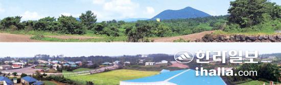 바리메오름과 멀리 한라산이 보이는 중산간 지역 풍경(위). 마을회관 옥상에서 동쪽으로 바라본 모습(아래).