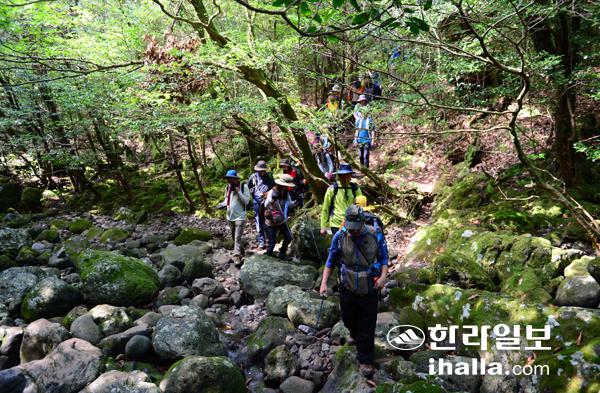 신례천 산책로에서 한라산둘레길까지 이어진 제7차 에코투어는 길디 긴 폭염 속 청량한 숲의 진가를 느낄 수 있는 여정이었다. 사진은 한라산 진달래밭 일대에서 발원해 공천포 해안으로 유입되는 신례천을 건너는 탐방객들. 강희만기자