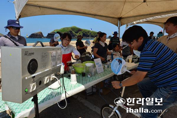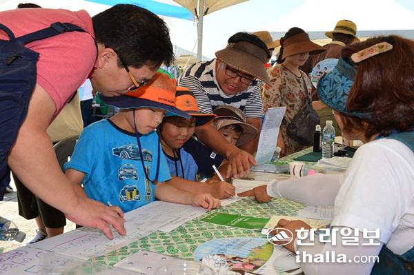 제주시 한경면 고산1리 자구내포구 일대 행사장에 마련된 '기후변화 이동체험 한마당'부스에는 개막 첫날부터 탐방객들로 북적였다. 특히 어린이를 비롯한 가족 단위 탐방객들에게 인기를 끌었다. 아이 어른 할것 없이 직접 보고 듣고 만들어 볼 수 있기 때문이다.