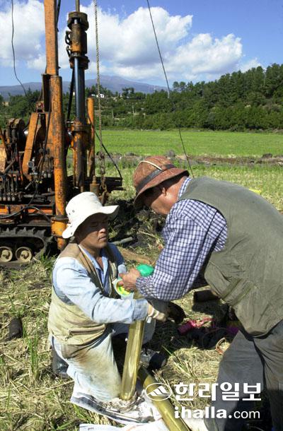 한반도 최대 규모의 마르형 분화구인 하논 퇴적층에 대한 시추 작업이 이루어지고 있다. 사진=한라일보 DB