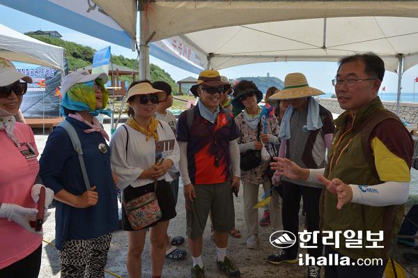 20일 제주 세계지질공원 수월봉 트레일 행사의 전문가 탐방에서 김완병 박사(오른쪽)가 탐방객들에게 수월봉 일대 지질과 화산활동, 일대 주변 철새이야기를 들려주고 있다. 강경민 기자