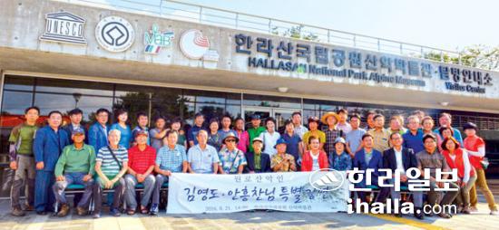 21일 열린 한라산국립공원 초청 원로 산악인 특강 참석자들이 김영도·안흥찬 선생과 함께 기념촬영을 하고 있다. 강경민기자