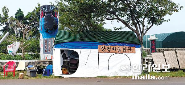 해군기지 부근 길가 농성천막에 걸린 현판이 숙연함을 불러온다.