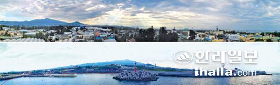 한라산에서 강정까지 구름을 뚫고 아침이 밝아오는 광경(위)과 서쪽 강정포구에서 해군기지에 이르는 모습(아래).
