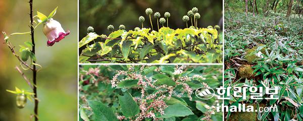 9차 에코투어에서 만난 숲 속의 여러 식물들. 왼쪽부터 더덕꽃, 산딸나무 열매, 호장근, 조릿대. 강희만기자
