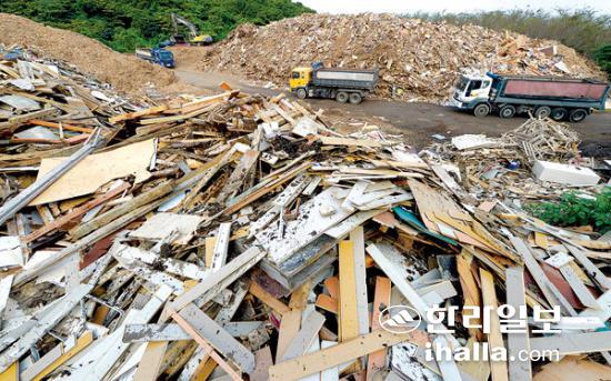제주시 폐목재 야적지. 규모가 협소해 반입되는 폐목재의 상당량을 별도 예산을 들여 도외로 반출해야 하는 실정이다. 강희만기자
