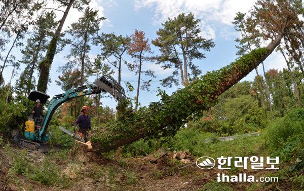 제주 소나무숲을 황폐화시키고 있는 재선충병에 걸린 고사목이 올해도 대량 발생해 산림당국을 긴장시키고 있다. 4차 방제기간인 내년 4월까지 고사목 25만여그루가 추가로 제거될 것으로 보인다. 사진은 지난 3차방제기간에 고사목을 제거하고 있는 장면. 사진= 한라일보DB