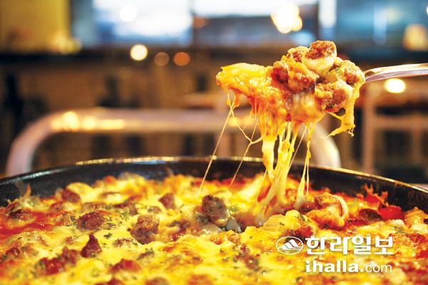 프라이팬에 도우없이 나오는 '불고기맛 떠먹는 피자'.