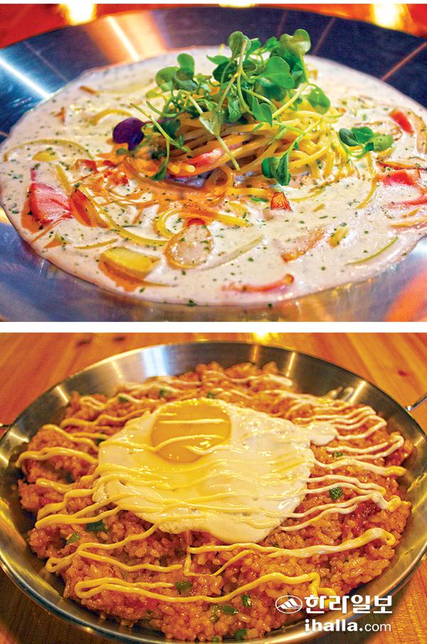 크림 베이컨 파스타(위)와 치킨 필라프.