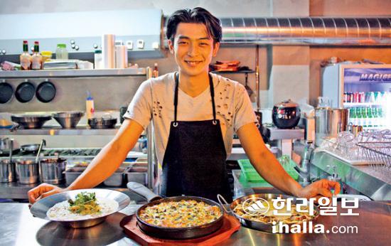 'There'의 20대 주인장 김현씨가 '불고기맛 떠먹는 피자' 등 음식점의 대표 메뉴를 차려놓고 포즈를 취했다. 이태윤기자