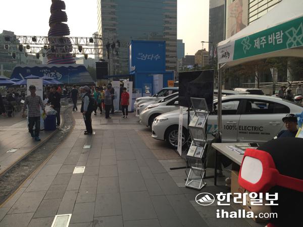 서울 청계천에 설치됐던 제주도 전기차 홍보 부스.