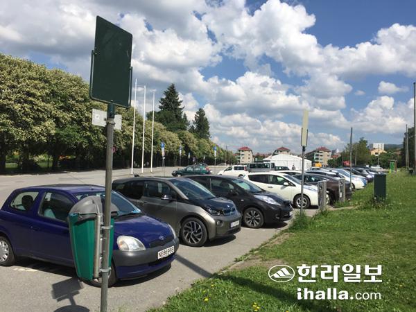 오슬로 뭉크박물관 인근의 전기차 주차장.