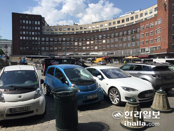 노르웨이 오슬로 시청사 앞에 세워진 전기차.