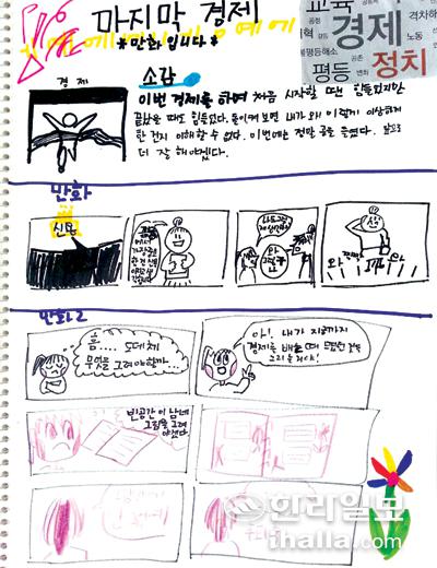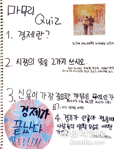 경제의 마지막 수업은 그동안의 과정을 다시한번 정리하고 되돌아보면서 소감과 경험을 나누는 시간으로 구성했다. 어린이들의 솔직담백한 감정이 그대로 드러나 있고, 그동안 익혔던 경제용어들을 살펴보면서 활동지들을 되짚어보았다. 경제수업에서 자신이 가장 중요하게 생각했던 부분들을 만화, 퀴즈, 광고, 시로 표현하게 했다.