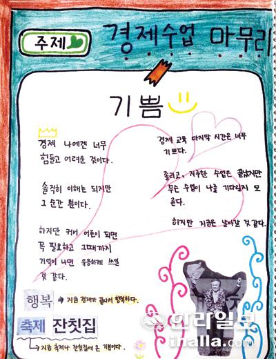 이번 경제교육이 어린이들의 진로를 걸어가는데 경제인으로서 첫 발걸음을 딛는 시간이었기를 바란다. 단순히 돈을 버는 방법으로의 경제가 아니고 자신을 둘러싼 세계에 대한 관찰과 민감성의 경제이기 때문이다. 경제는 세상의 모습을 모두 담고 있는 커다란 그릇이다. 복잡한 세상의 문제들과 사회현상들도 경제를 이해하면 하나 하나 풀어나갈 수 있으며, 경제교육은 미래의 주인공을 지원하는 큰 프로젝트이다. <제주NIE학회>
