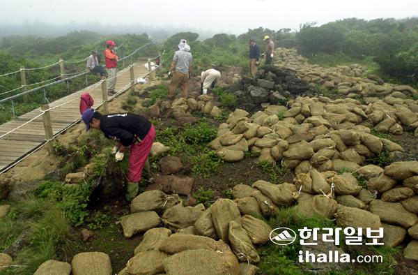 첫 복구작업은 1991년 어리목 등산로에서 이뤄졌다. 어리목 등산로 주변은 7만4000㎡가 훼손돼 전체 훼손면적의 32.8%를 차지했던 곳이다. 이 때 앙카매트 기법이 처음 시도됐다. 토양안정재료인 그물매트를 깔고 벼과식물 '새'를 심는 방식이었다. 이듬해 동일한 방식으로 정상 서북벽 길목인 장구목 일대까지 복구작업이 이뤄졌다.