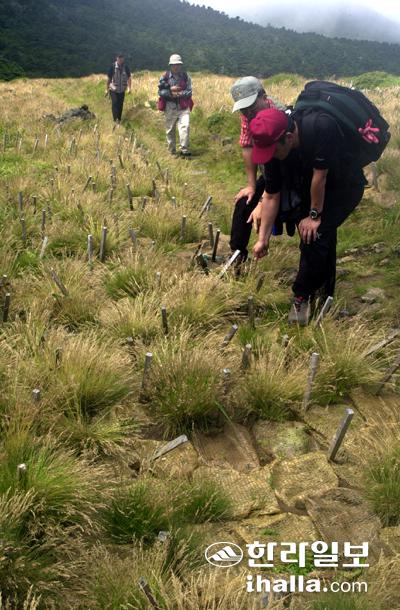 한라산 훼손지 복구사업은 복구 공법, 복구 범위 등 숱한 시행착오를 겪으며 2006년 사실상 종료됐다. 사진은 장구목 일대 등반로 훼손지 관찰(2003년)강경민기자