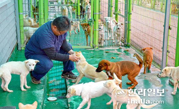1일 제주 광역유기동물보호센터에서 수의사가 유기견의 건강 상태를 살피고 있다. 강희만기자