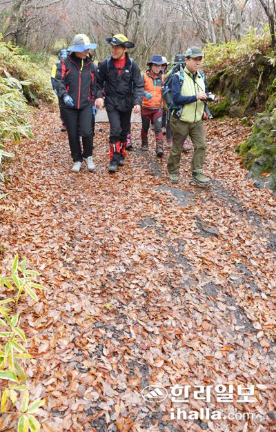 낙엽이 쌓인 길을 따라 걷는 참가자들