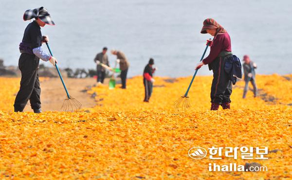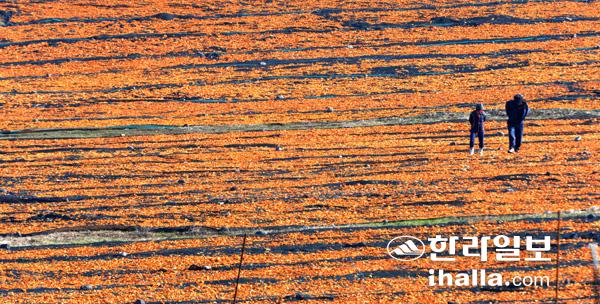 초겨울 날씨속 따스한 햇살을 비춘 서귀포시 성산읍 신천목장에는 주황색 물감을 뿌려 놓은 듯 감귤껍질을 말리는 풍경이 장관을 이루고 있다. 한라일보DB