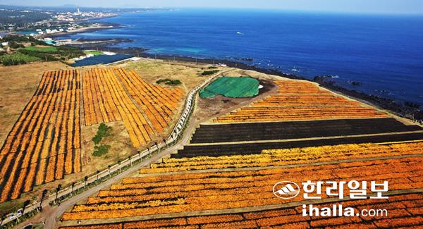 초겨울 날씨속 따스한 햇살을 비춘 서귀포시 성산읍 신천목장에는 주황색 물감을 뿌려 놓은 듯 감귤껍질을 말리는 풍경이 장관을 이루고 있다. 한라일보DB