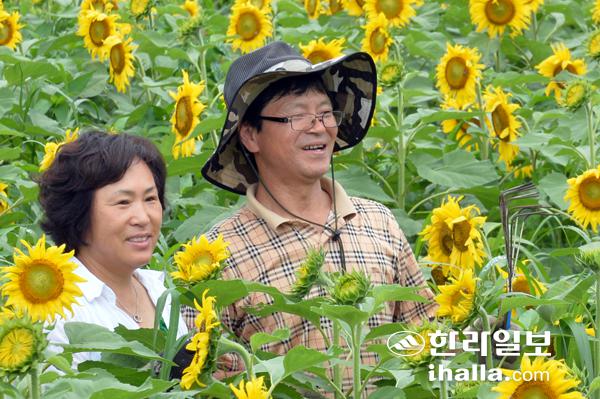 친환경으로 해바라기를 재배하는 귀농 3년차 김승웅·김경숙씨 부부.