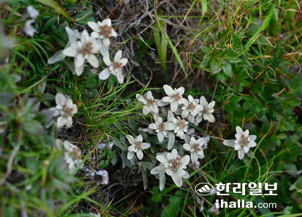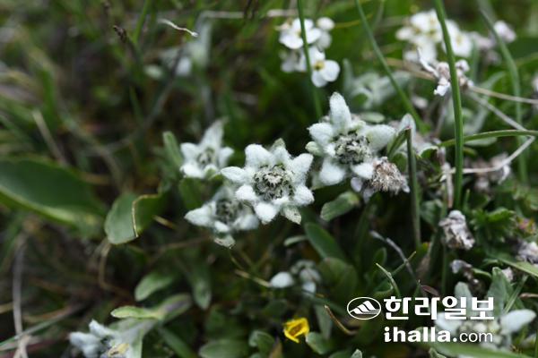 정상을 향해 가던 중 해발 3080m 지점에서 우리는 한라산의 종과 직접 관련이 있는 꽃을 만났다. 바로 에델바이스의 일종인 연노랑솜다리