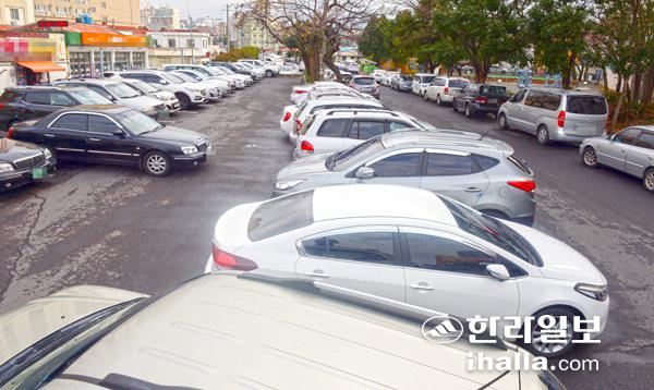 제주지역 주차난을 반영하듯 제주시내 한 주차장에 차량들이 빼곡하게 세워져있다. 강희만기자
